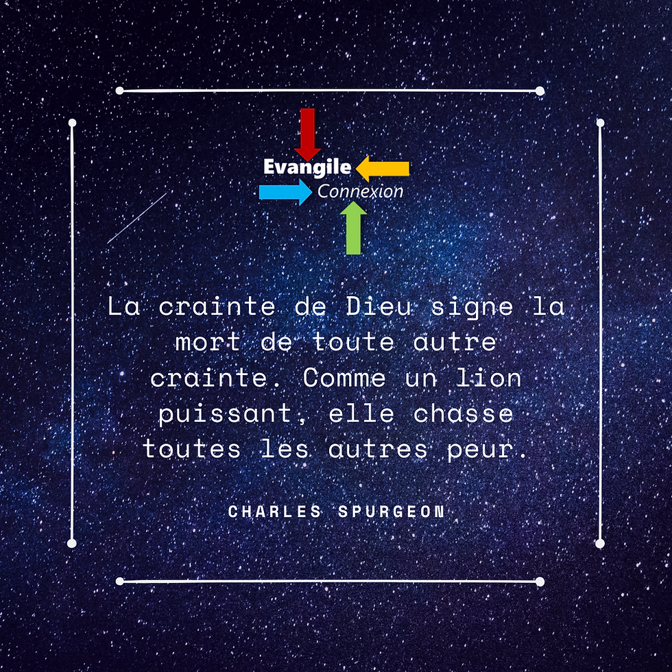 La crainte de Dieu7 oct. 20201 min de lectureLa crainte de Dieu signe la mort de toute autre crainte. Comme un lion puissant, elle chasse toutes les autres peur.Charles Spurgeon
